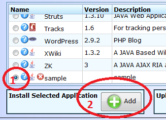 5. Install uploaded .war file from list of available applications. Usually uploaded .war file will get listed at bottom of list of applications. Seilect the uploaded application from the list and click "Add" button. To remove and uploaded .war file from list, click the red colour x button next to the uploaded application.