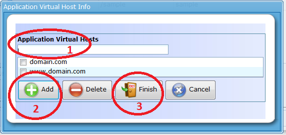 7. Enter domain name in the format www.domain.com and domain.com as showin in image files below. after putting www.domain.com click "Add" button, then domain.com and then click "Add" button again. After enter two formats, click the "Finish" button. Remember to replace domain.com with your hosting domain name.
